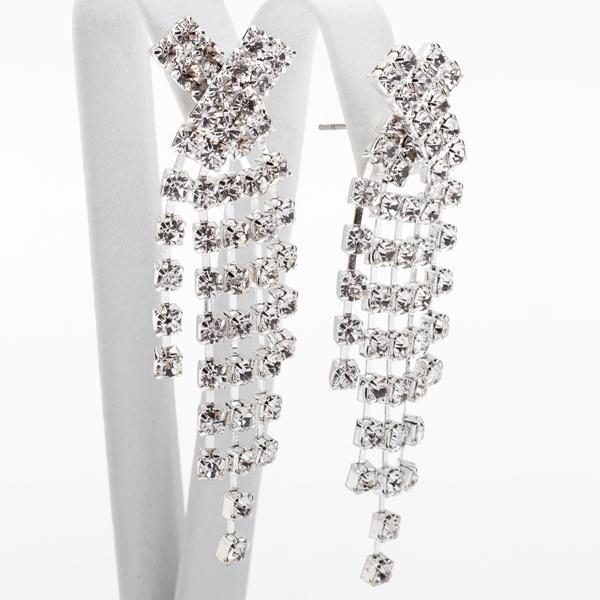 Сережки-пусети, білий метал, білі стрази, розмір 6х1,5 см